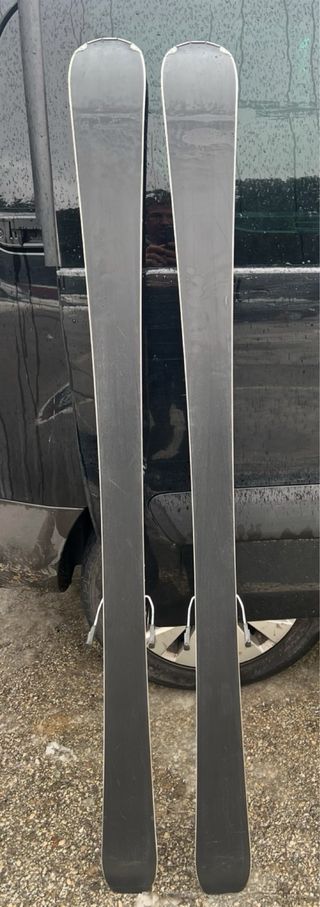 Pack de esquís alpino Salomon Stance 80 para mujer, usados 2 veces el mismo año. - Esquís de color gris claro y gris azulado. - Fijaciones blancas. - Incluye bastones de esquí blancos.