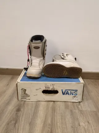 Botas de snowboard para mujer en talla 8 (equivalente a 38.5 EU). Les faltan los cordones - Marca: Vans - Modelo: Mantra - Color: Blanco y gris