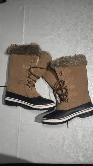 Estas son las botas de invierno Katsura para mujer de la marca Northside Talla -39,40 Detalles del Producto Marca: Northside Modelo: Katsura (o Katsura II) Tipo: Bota de invierno aislante e impermeable Materiales: A menudo cuentan con parte superior de ante o cuero sintético y un forro de piel sintética Características: Diseñadas con cierre de cordones con anillas en D, suela de caucho duradera para tracción en condiciones frías y aislamiento Thinsulate - Color marrón y negro. - Cierre de cordones. - Suela de goma antideslizante. - Detalle de ribete blanco y rojo en la suela.