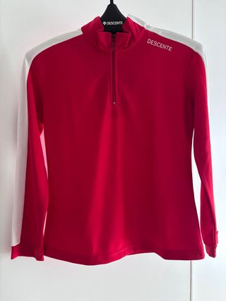 Prenda térmica de manga larga con cuello cisne y cremallera. - Color rojo con detalles blancos en los hombros y mangas. - Logo de Descente en blanco en el cuello y en la manga. - Cremallera frontal hasta medio pecho.