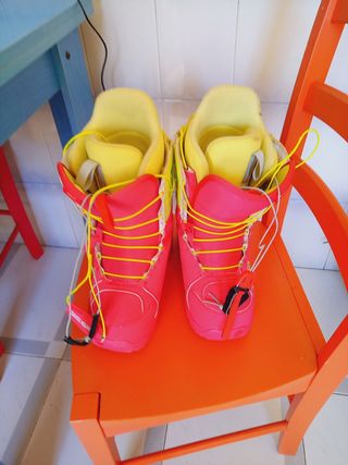 Botas de snowboard DC en color rojo. Diseñadas para mujer. Me las quedaría pero a mi novia le quedan grandes y a mi pequeñas. Incluyen sistema BOA funcionando en perfectas condiciones. Talla EU 40 En buenas condiciones