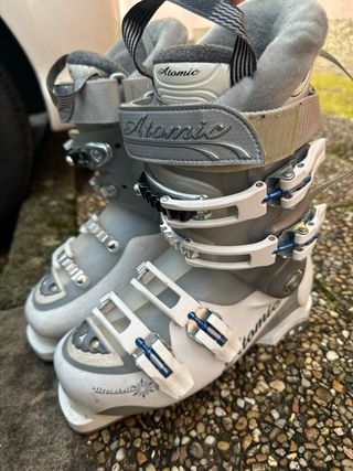 Botas de esquí ATOMIC para mujer, modelo femenino en color blanco y gris con diseño elegante. Ideales para esquí recreativo e intermedio. - Sistema RECCO integrado para mayor seguridad en montaña. - Plantilla / botín con posibilidad calefactable. - 4 ganchos micrométricos para un ajuste seguro y preciso. - Power strap superior para mayor sujeción de la pierna. - Botín interior acolchado, muy cómodo y cálido. - Carcasa resistente. - Buen equilibrio entre comodidad y control. - Estado: En buen estado, con signos normales de uso, totalmente funcionales.