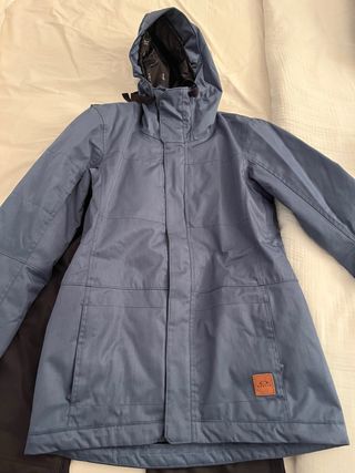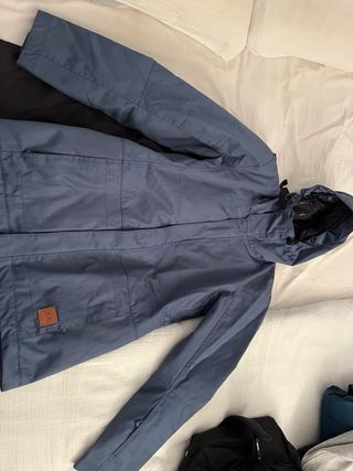 Chaqueta de esquí de la marca Oakley, diseñada para mujer. La jaqueta es de color azul con un acabado texturizado y un detalle de logo en la parte inferior. - Capucha ajustable. - Cierre frontal con cremallera. - Bolsillos laterales. - talla M (tallaje relativamente grande, vendo porque me va grande)