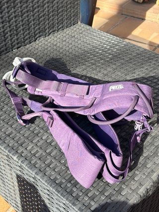 Arnés de escalada Petzl en excelente estado, diseñado para mujer y talla XL. fue usado 3 veces en rocódromo. Incluye su bolsa de transporte. - Color lila. - Cierre con hebillas. - Acolchado en cintura y perneras.
