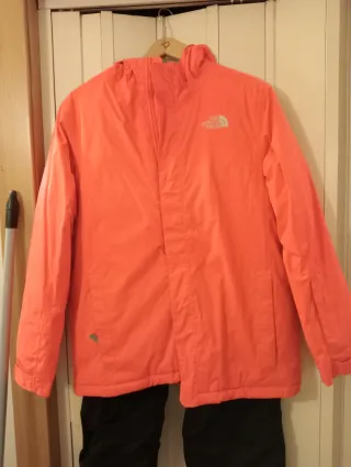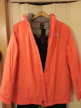 Conjunto de esquí de la marca The North Face para mujer. - Chaqueta de color naranja brillante. - Pantalones negros.