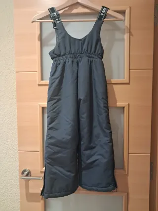 Pantalones de esquí o nieve para niño/niña de 6 años. Son negros y cuentan con tirantes ajustables. - Tirantes ajustables. - Bolsillos con cremallera. - Detalle de líneas rojas y blancas en los bajos.