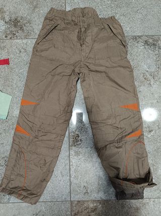 Pantalón de nieve para niño/a, ideal para mantener el calor y la sequedad en la montaña. - Color marrón con detalles naranjas. - Diseño acolchado. - Cintura elástica. Tiene desgaste en la parte trasera, mirar foto, por eso su precio.