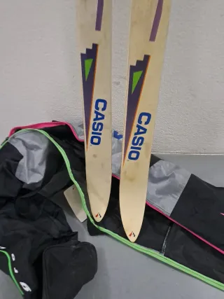 Conjunto de esquís de la marca Rossignol con detalles de Casio. - Esquís de color blanco y beige. - Diseño con detalles en azul, naranja y morado.