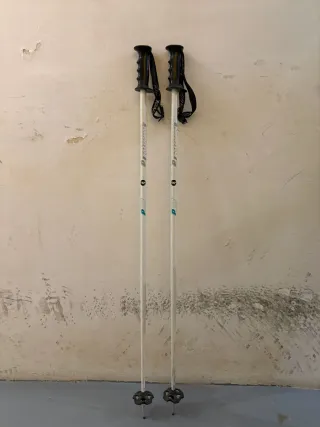 Se venden palos de esquí de la marca Rossignol. Son de color blanco con detalles en azul y verde. - Mangos de color morado. - Correas de sujeción. - Puntos naranjas en los palos.
