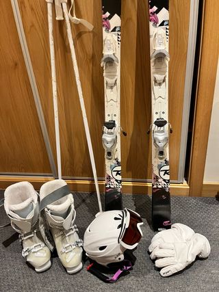 Conjunto completo de esquí para disfrutar de la montaña. Incluye esquís, botas y casco. - Esquís Rossignol con fijaciones. Para persona de 160 a 165cm de altura - Botas de esquí wedze talla 39 ( con su bolsa) - bastones para 165cm de altura - Casco de esquí blanco con detalles - guantes Talla S - casco talla M - gafas esqui.