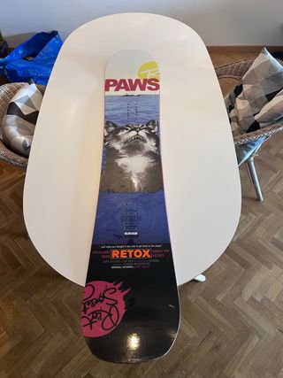 Tabla de snowboard Rossignol Retox con un diseño llamativo. Buen estado pero con algunas marcas de uso normales. La vendo porque ya no me entro al parck. - Modelo: Retox - Longitud: 150 cm - Diseño Paws con gato - Gráficos Super Top Secret