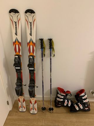 Conjunto de esquí para niños, ideal para iniciarse en este deporte. Incluye esquís, bastones y botas. - Esquís 120 cm Rossignol Pursuit. - Bastones de esquí 95 cm. - Botas de esquí Nordica negras con detalles rojos y blancos. Talla 22,5