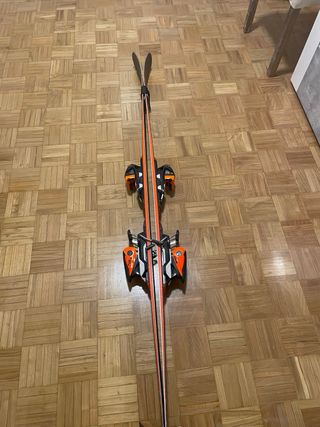 Esquís de la marca Rossignol, modelo World Cup Radical. - Diseño en naranja, negro y verde. - Fijaciones incluidas. Con bastante uso, hace falta mantenimiento