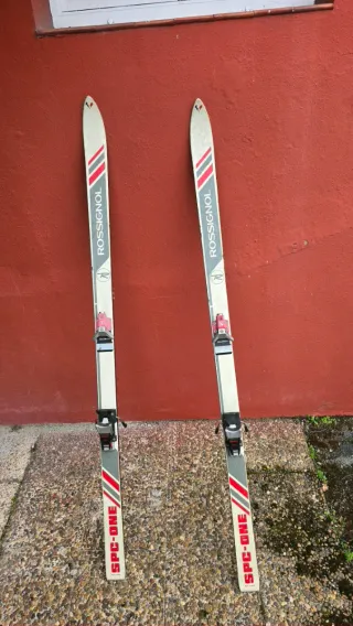 Conjunto de esquís vintage de las marcas Rossignol y Carrera. Ideales para coleccionistas o amantes del esquí clásico, o para decoracion de tienda deportiva - Esquís Rossignol con diseño clásico. - Esquís Carrera con detalles distintivos. - Fijaciones incluidas en ambos pares.