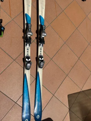 skis rossignol, fijaciones marker. palos dynastar. un esquí tiene la punta rota. un palo está ligeramente doblado.