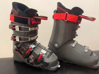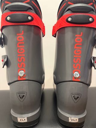 Botas de esquí Rossignol gama alta, talla 27,5 (equivale a un 43/44), usadas pero en buen estado, sólo le falta reponer las suelas de plástico que se han roto, como se aprecia en las fotos. Ganchos y el resto funcionan perfectamente.