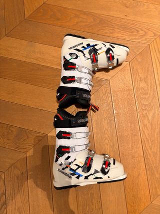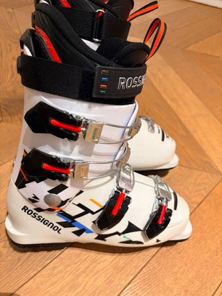 Talla 24.5 Mondopoint, 288mm de suela. Flex 65. Usadas pero en buen estado. Por el precio del alquiler de unos días te las quedas. Botas de esquí junior de la marca Rossignol, modelo Hero JR 65. Diseñadas para jóvenes esquiadores. - Color blanco con detalles gráficos. - Cierres de hebilla metálica. - Logo de Rossignol visible.