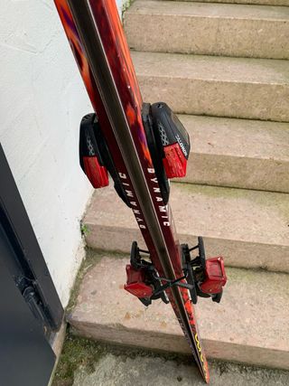Esquís DYNAMIC para adulto con fijaciones Salomon. - Diseño en tonos rojos y naranjas con detalles morados. - Fijaciones Salomon en color negro y rojo.