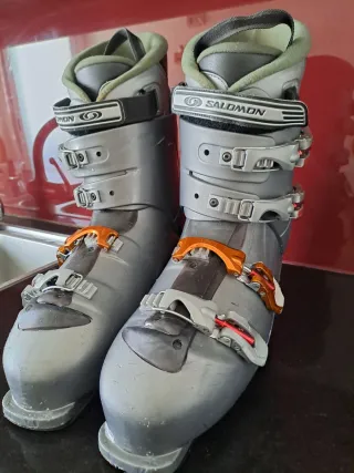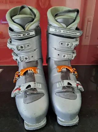 Botas de esquí de la marca Salomon, diseñadas para ofrecer comodidad y rendimiento en la nieve. - Color gris plateado. - Cierre con hebillas. - Detalle de color naranja en las hebillas.