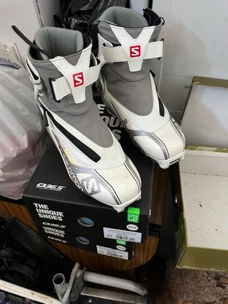 Botas de esquí de fondo Salomon Q36.5. Talla US 8.5 - Diseño en blanco y gris. - Cierre BOA. - Logo de Salomon visible.