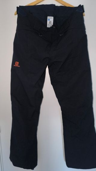 Pantalón de ski de la marca Salomon en talle L. Diseñado para actividades en la nieve. - Color negro. - Logo de Salomon en naranja en la pierna derecha.