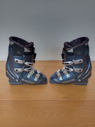 Botas esquí Salomon Evolution 8 Performa. Color azul marino. Talla 27-28,5. Usadas, con los roces de uso habituales. Longitud exterior de suela 312mm. Yo tengo talla de pie 43 en calzado normal de calle. Sistema Flex y Carving. El enganche delantero fijo de la bota derecha (no la parte móvil sino la que está completamente fijada a la bota) estaba un poco suelto así que lo he cambiado (se ve en las fotos) y ahora está bien fijo. Las taloneras están cambiadas a estrenar (ver fotos). Incluyo de regalo la bolsa de transporte de las botas.