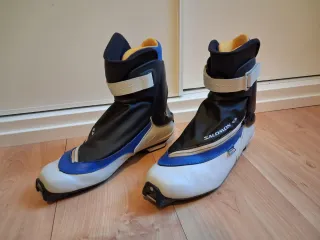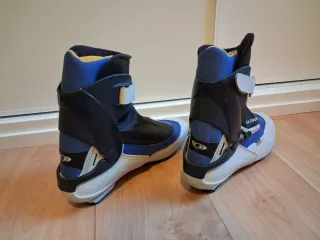 Botas de esquí de fondo marca Salomon, talla 42. Diseñadas para ofrecer comodidad y rendimiento en la nieve. - Color blanco, azul y negro. - Cierre con velcro. - Interior forrado en amarillo.