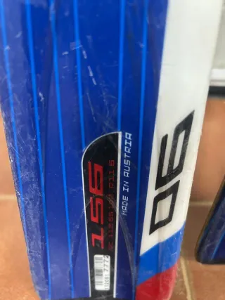 Esquís de la marca Salomon con una longitud de 156 cm. Diseñados para ofrecer un buen rendimiento en pista. Tienen un daño atrás en un talón. Ver foto. - Esquís Salomon - Longitud: 156 cm - Modelo: Streetracer 06 - Color: Azul, blanco y rojo