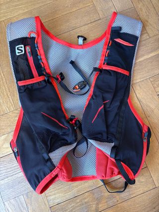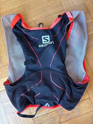 Mochila de hidratación Salomon de 5 litros, diseñada para trail running y actividades al aire libre. Talla M-L chico - Color negro y rojo. - Malla transpirable. - Bolsillos frontales y laterales.