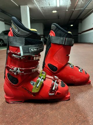 Botas de esquí Salomon X-Wave en color rojo. Varios compradores con un 42 las han probado y no les servían, por lo que las recomiendo para un 39 o 40. - Talla 26 (equivalente a 42 EU). - Cierres de hebilla. - Correa de velcro superior.