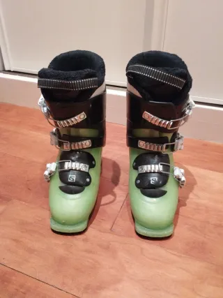 Botas de esquí Salomon T3 en talla 22/22.5. 266mm. Equivale a una talla 35/36 europea - Color verde lima y negro. - Cierre con hebillas. - Interior forrado.