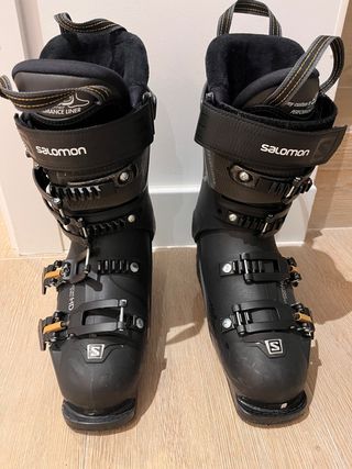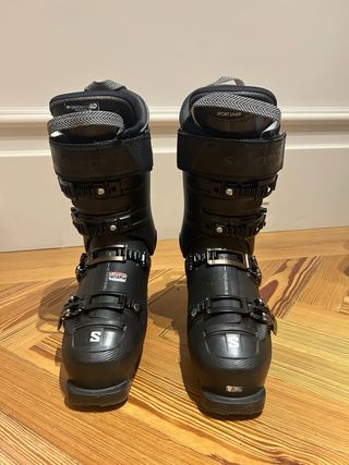 Botas de esquí de la marca Salomon en excelente estado, casi nuevas. Diseñadas para ofrecer comodidad y rendimiento en la pista. - Color negro y detalles plateados. - Cierres de hebilla ajustables. - Interior acolchado para mayor confort.
