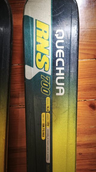 Esquís Quechua RNS 700 usados pero en bastante buen estado. Ideales para principiantes o nivel intermedio. Están encerrados y afiliados los cantos. Listos para usarlos. - Medida: 177 cm - Fijaciones Salomon