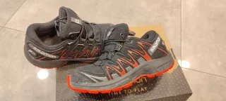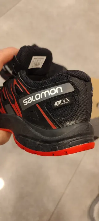 Zapatillas de senderismo Salomon para niño o niña en talla 31. Diseñadas para la aventura al aire libre. En perfecto estado pues han tenido muy poco uso... - Color negro con detalles en rojo, preciosas. - Fácil apriete sin lazo. - Suela Contragrip en perfecto estado, muy buen agarre. - Impermeables (waterproof).
