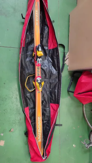 Se venden esquís de la marca Dynastar, listos para la acción. Incluyen una funda para su transporte y protección. - Esquís de color naranja y amarillo. - Fijaciones de esquí amarillas y rojas. - Funda de esquí roja y negra.