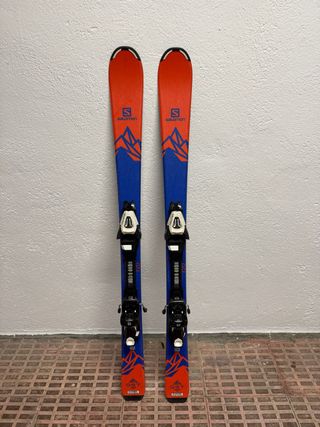 Esquís Salomon QST de 120cm con fijaciones. - Diseño con montañas en naranja y azul. - Fijaciones Salomon. - Modelo QST 120
