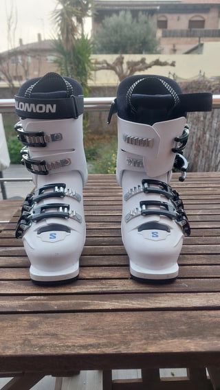 Botas de esquí Salomon en color negro y blanco. - Talla 23 - 23.5. - Longitud de suela de 276 mm. - 3 Cierres de hebilla.