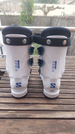 Botas de esquí Salomon S/Max en talla 22-22.5. Vendedor serio, ver perfil , interior como nuevo, 1 temporada. - Color blanco con detalles en azul. - Cierres de hebilla. - Marca Salomon visible.