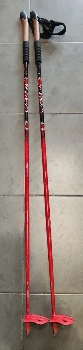 Conjunto de esquís Salomon XFree 7.9 de 173 cm, listos para la nieve. Incluye bastones de esquí. SOLO SE HA USADO UNA VEZ. - Esquís de color rojo con detalles blancos y grises. - Fijaciones Salomon 725. - Bastones negros con empuñadura ergonómica.