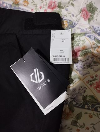 Pantalones de esquí o snowboard DARE2B. - Color negro. - Talla M (38/10). - Cierre de botón y cremallera. - Cintura ajustable con velcro. - Bolsillo lateral con solapa.