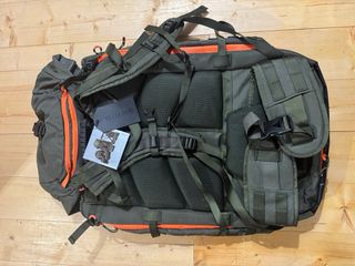 Mochila Beretta de gran capacidad, ideal para actividades al aire libre. - Color verde con detalles en naranja. - Diseño con múltiples compartimentos y correas. - Logo de Beretta visible en la parte frontal y superior.