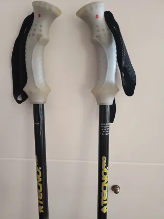 Par de bastones de esquí de la marca Tecno Pro. Miden 110 cm. Creo que no los he usado nunca - Modelo: Cross. - Empuñaduras ergonómicas. - Correas de sujeción. - Puntas de goma.