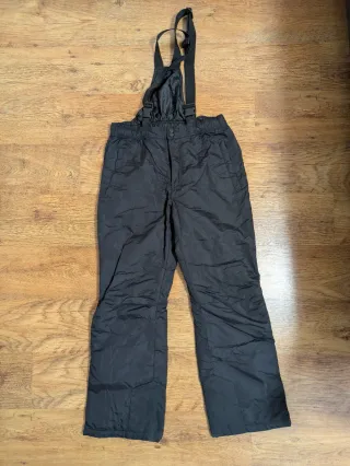 Pantalón de esquí negro con tirantes ajustables. Diseñado para ofrecer comodidad y protección en la nieve. - Tirantes negros. - Cintura elástica. - Cierre de cremallera y botón. - Talla XL - Ligero desgaste en la parte de abajo - Guantes para nieve de regalo