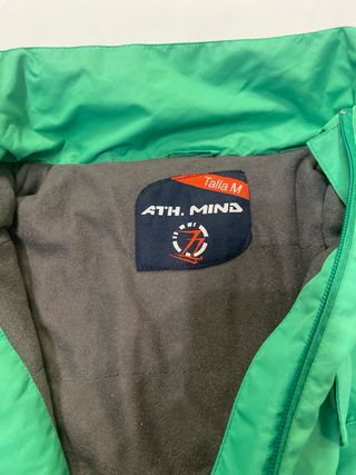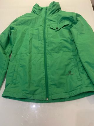 Chaqueta de esquí de color verde con capucha. Perfecta para actividades al aire libre. - Cierre de cremallera frontal. - Dos bolsillos laterales con cremallera. - Logo circular en el pecho.