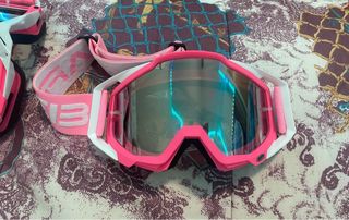 Gafas de esquí con un diseño moderno y llamativo. - Montura de color rosa y blanco. - Correa elástica.