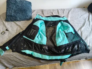 Abrigo de esquí para niña/adolescente en color negro y turquesa. Ideal para mantenerse abrigada y protegida en la montaña. Tiene poco uso, lo vendo porque ya no nos vale de tamaño y hay que cambiarlo a uno más grande. * TALLA 38 EU (EQUIVALENTE A UNA TALLA S) (FOTO DE LA TALLA 4° FOTOGRAFÍA) * MARCA CRIVIT (LIDL) - Diseño con capucha. - Cremallera frontal. - Puños con orificio para pulgar. - Unonton de bolsillos con cremallera. - Gomas para ajustarlo. - También tiene unos botones para abrocharse por abajo y no entre nieve, actúa como chubasquero.