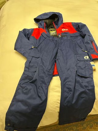 Conjunto de esquí para niño, talla 12-14 años. Incluye chaqueta y pantalón de muy buena calidad. Cada prenda por separado 30€. Con la compra del equipo regalo el FIFA 22 para PS4 y un camiseta termica negra talla 14. - Chaqueta azul y roja con capucha. - Pantalón azul con bolsillos cargo. - Marca Picture Organic Clothing.