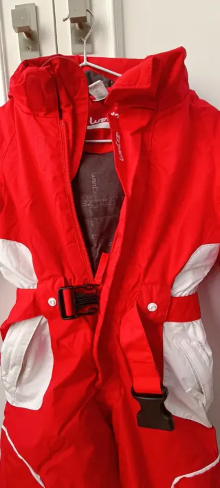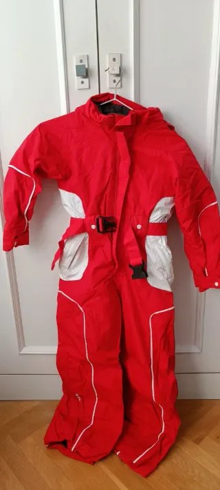 Traje de esquí completo en color rojo, talla 8 años. - Cremallera frontal. - Bolsillos con cremallera. - Gorro extraíble.