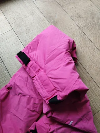 Conjunto de esquí para niña, talla 8-10 años. Incluye chaqueta y pantalón y guantes a juego. - Chaqueta azul con interior fucsia de forro polar. Las mangas son ajustables y tienen mitones de licra para proteger las manos y dar calor. Numerosos bolsillos, incluido uno waterproof en la manga para proteger el forfait - Pantalón blanco de esquí con faldón cubrebotas para proteger de la entrada de nieve - Guantes rosas y blancos. Usado pero en perfectas condiciones