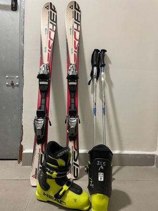 Conjunto de esquí para niños, ideal para aprender y disfrutar de la nieve. - Esquís Fischer Progressor SCR. - Botas de esquí Head. - Bastones de esquí.